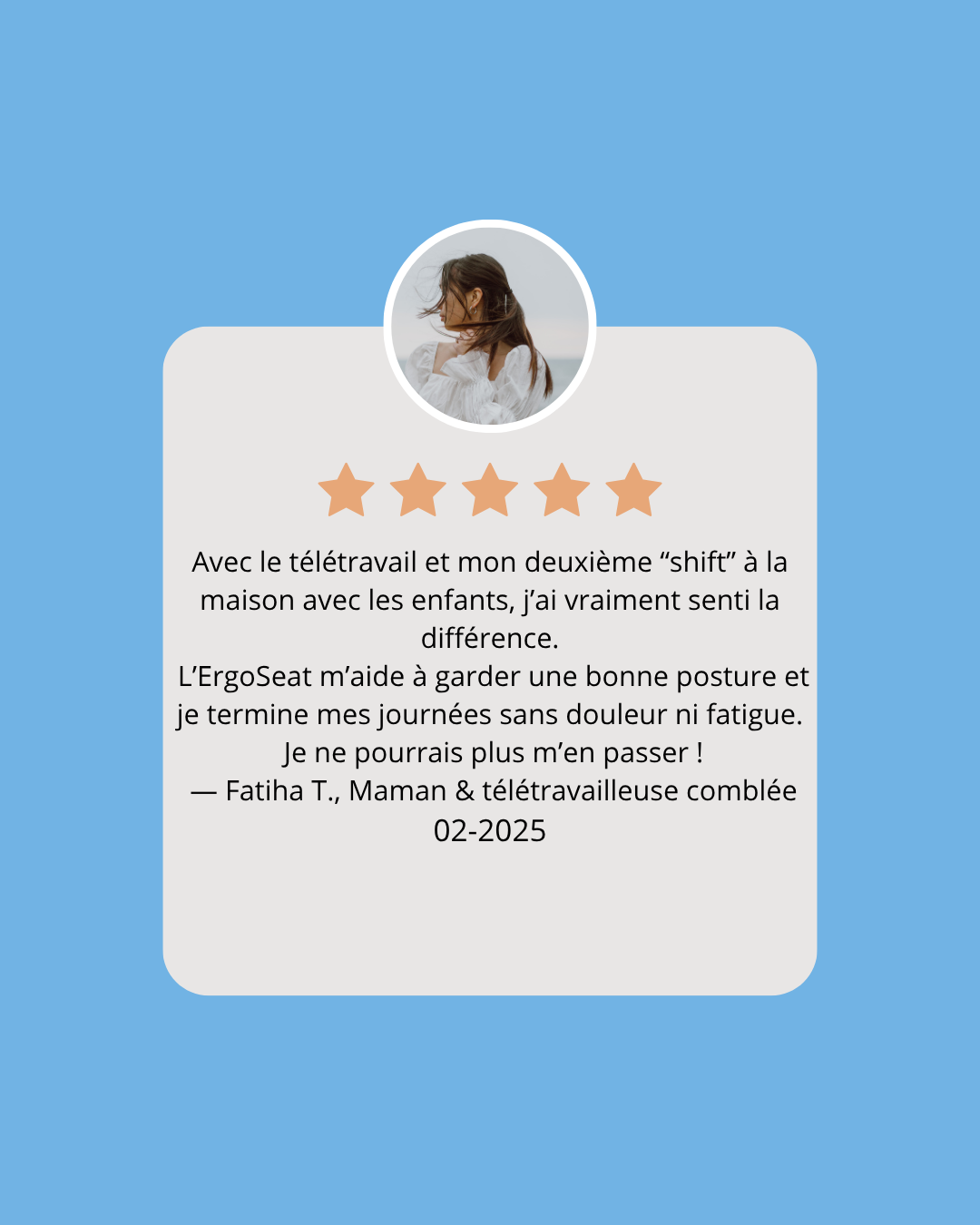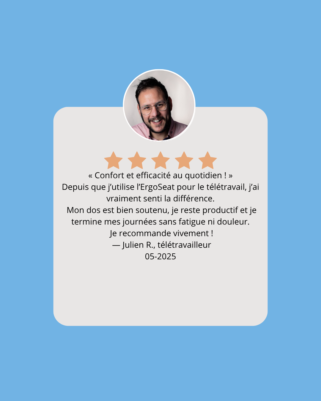 “En tant que kinésithérapeute, je recommande l’usage d’un coussin ergonomique comme ErgoSeat™ pour prévenir les douleurs lombaires chez les télétravailleurs. Il aide à maintenir une posture saine et réduit les tensions musculaires sur le long terme.” — Dr. Sophie Martin, kinésithérapeute